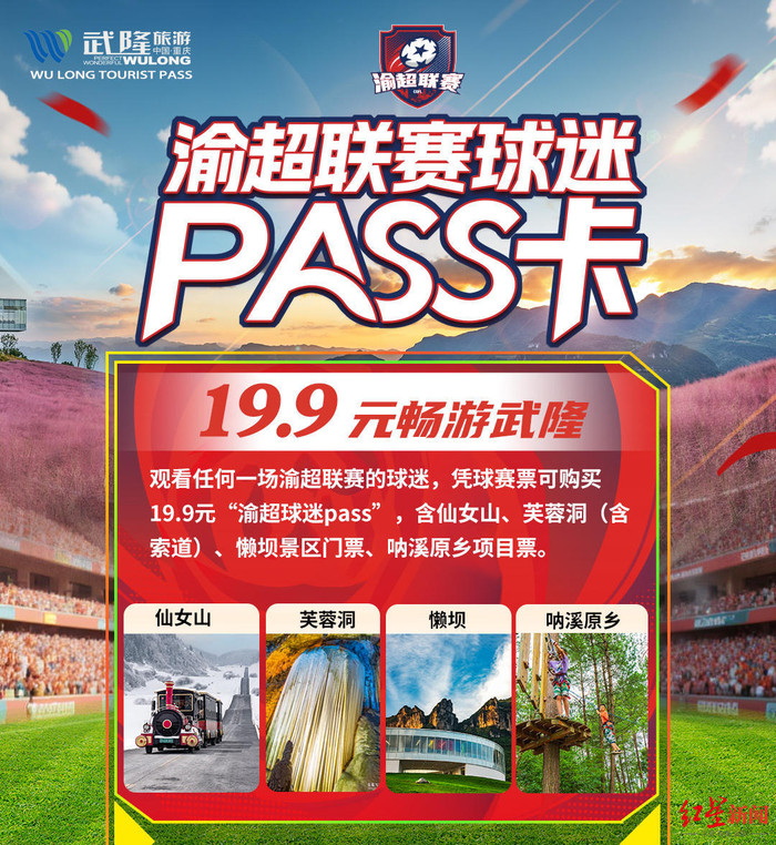 武隆景区日前特意推出渝超联赛超值球迷专属福利,邀球迷在呐喊之余,漫步山水、放松身心:从即日起至2026年4月,凡持有渝超联赛观赛凭证的球迷,微信或者支付宝搜索“武隆景区官方平台”,凭购票记录即可抢购原价378元的超值景区套票,仅需19.9元。据悉,此武隆套票涵盖:仙女山、芙蓉洞、懒坝国际禅境艺术度假区和呐溪原乡四大核心景区,还包含芙蓉洞索道费用。