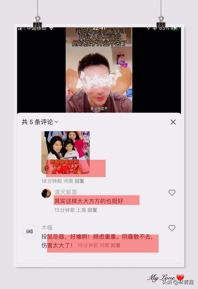 网友说汪小菲有点投鼠忌器,两个孩子是自己的,想露脸就大大方方露脸,没有必要一直被牵着鼻子走,看看人家郭晶晶三个孩子呢,不也是大大方方晒孩子,没有必要太害怕!