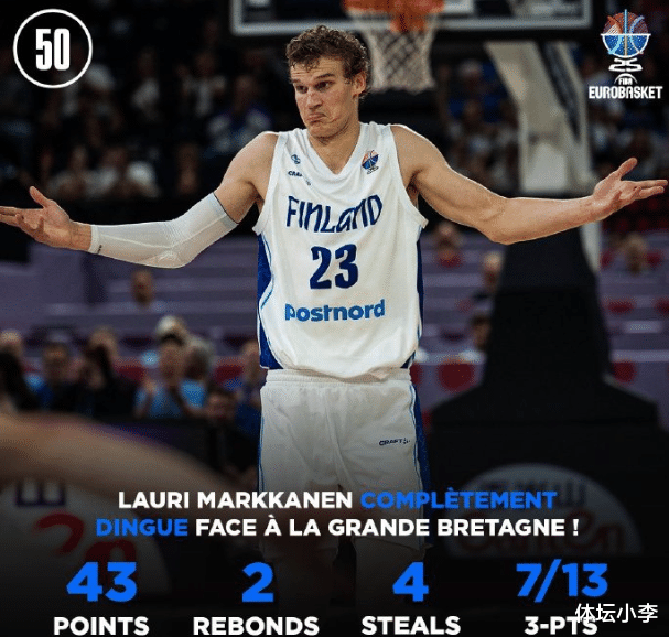 马尔卡宁效力于NBA爵士,此前他在热身赛就展现出火热的势头,没想到这次在欧洲杯正赛也展现出了自己的恐怖得分能力。全场只打23分钟的情况下,22投13中,三分13中7,罚球11中10,轰下43分,外加2篮板4抢断。这是本次欧洲杯的首个40+得分,也是马尔卡宁在欧洲杯的第二次40+,这进攻状态真的太火爆了。