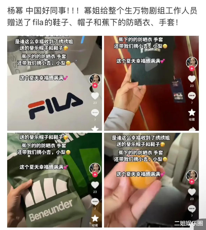 头上戴的帽子,还是杨幂给全组人送的,人人有份。
