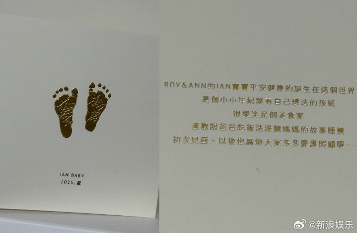 文中写道“IAN宝宝平安健康地诞生在这个世界上了。某个小小年纪就有自己想法的孩子,很爱笑,是个美食家,喜欢跟爸爸吃饭洗澡、听妈妈讲故事睡觉。初次见面,以后也麻烦大家多多爱护照顾喔。”