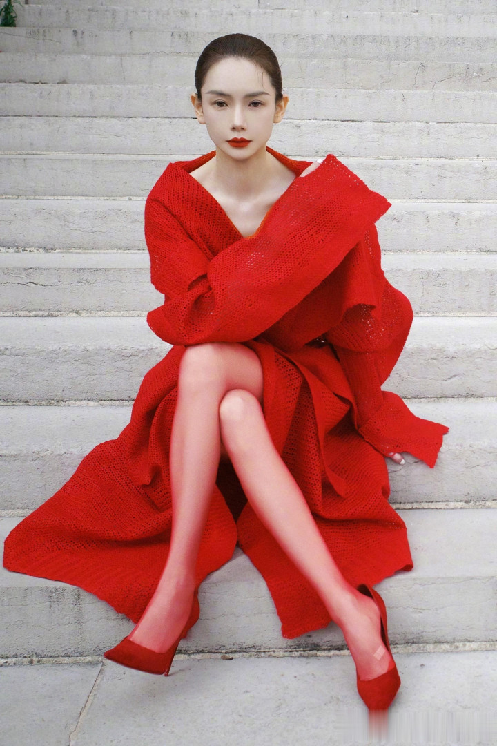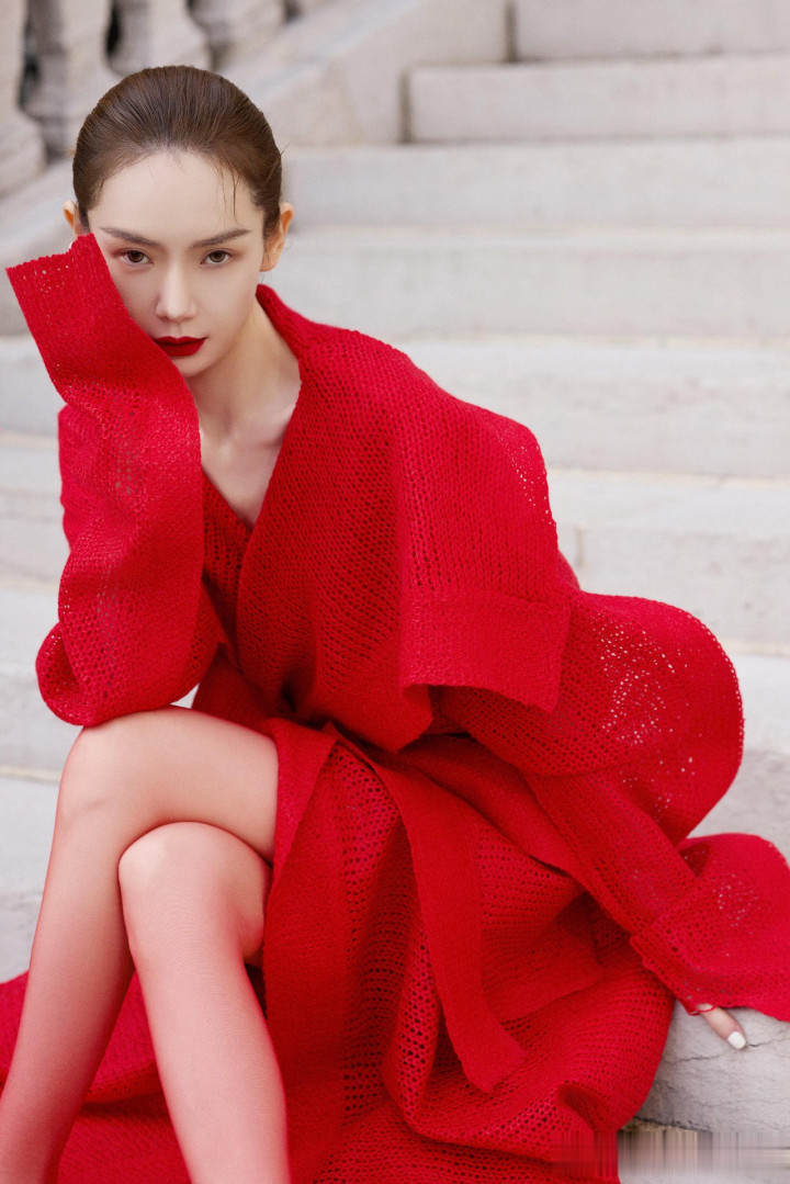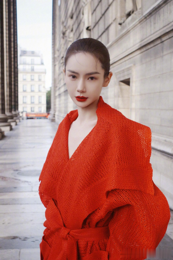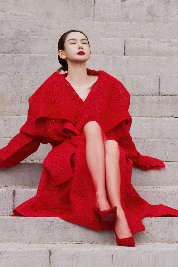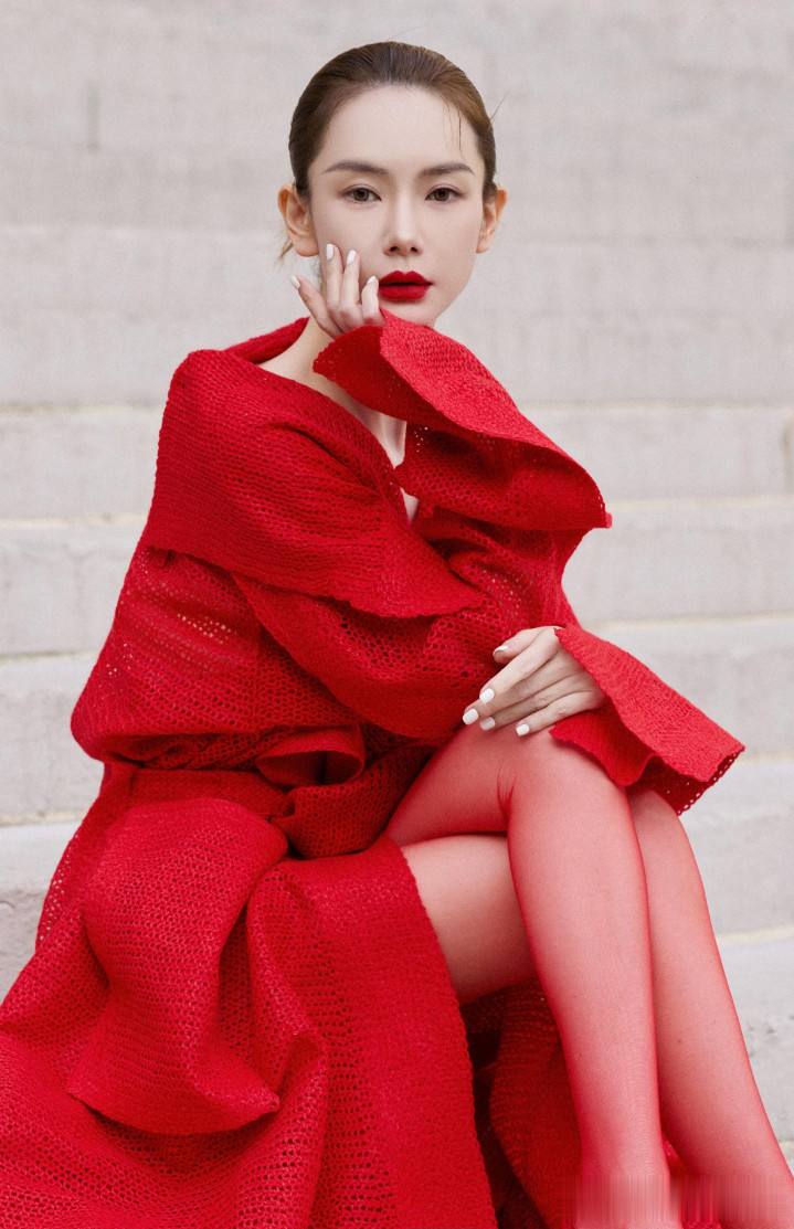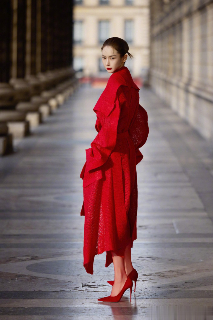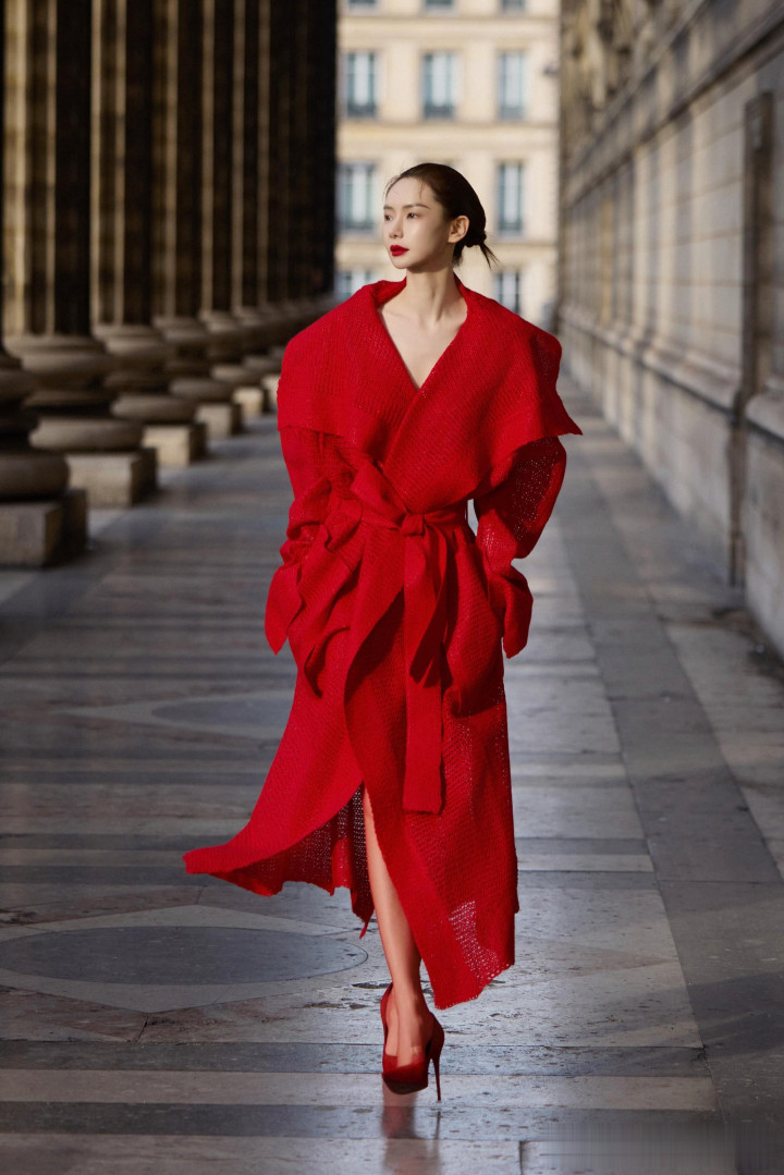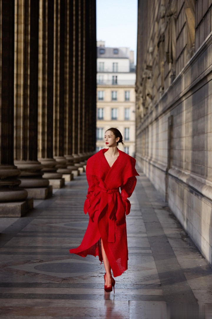 戚薇巴黎街头红装飒气, 针织大衣演绎时尚先锋魅力