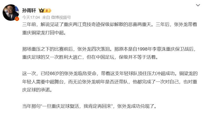 赛后,当时重庆两江保级战的解说孙雨轩在微博发文感慨。