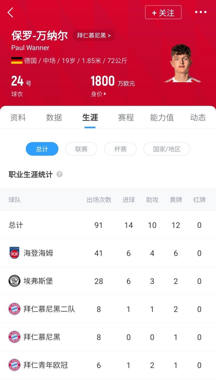 万纳尔,现年19岁,德国中场,上赛季被拜仁外租至海登海姆,出战41场比赛,贡献6球4助,目前德转身价1800万欧。