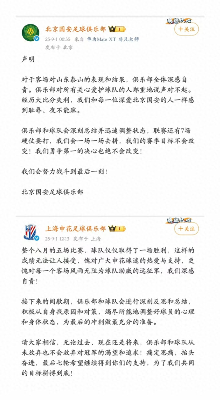 本轮中超榜首争冠四支球队中,海港、国安和申花三支球队输掉了比赛。9月1日,继北京国安俱乐部此前一天在社交媒体上公开向球迷道歉后,上海申花俱乐部也向球迷公开道歉。