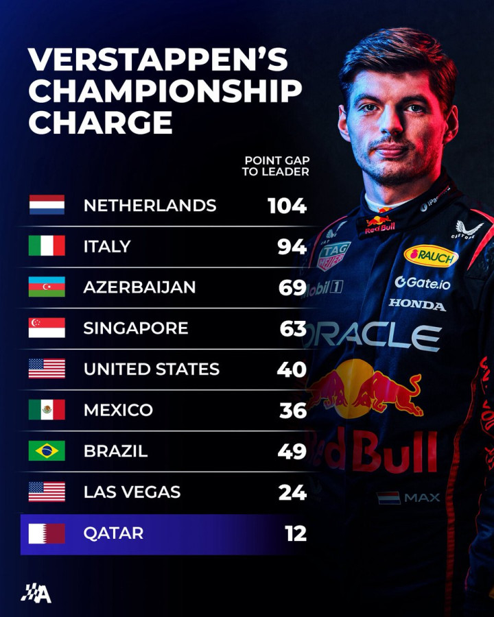 据统计,自荷兰站起维斯塔潘落后积分榜榜首104分,而在刚刚结束的卡塔尔站,他已将差距缩小至仅12分。如果在下一场阿布扎比站他夺冠,且诺里斯无缘前三,那么维斯塔潘将加冕个人第五座世界冠军。